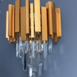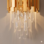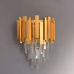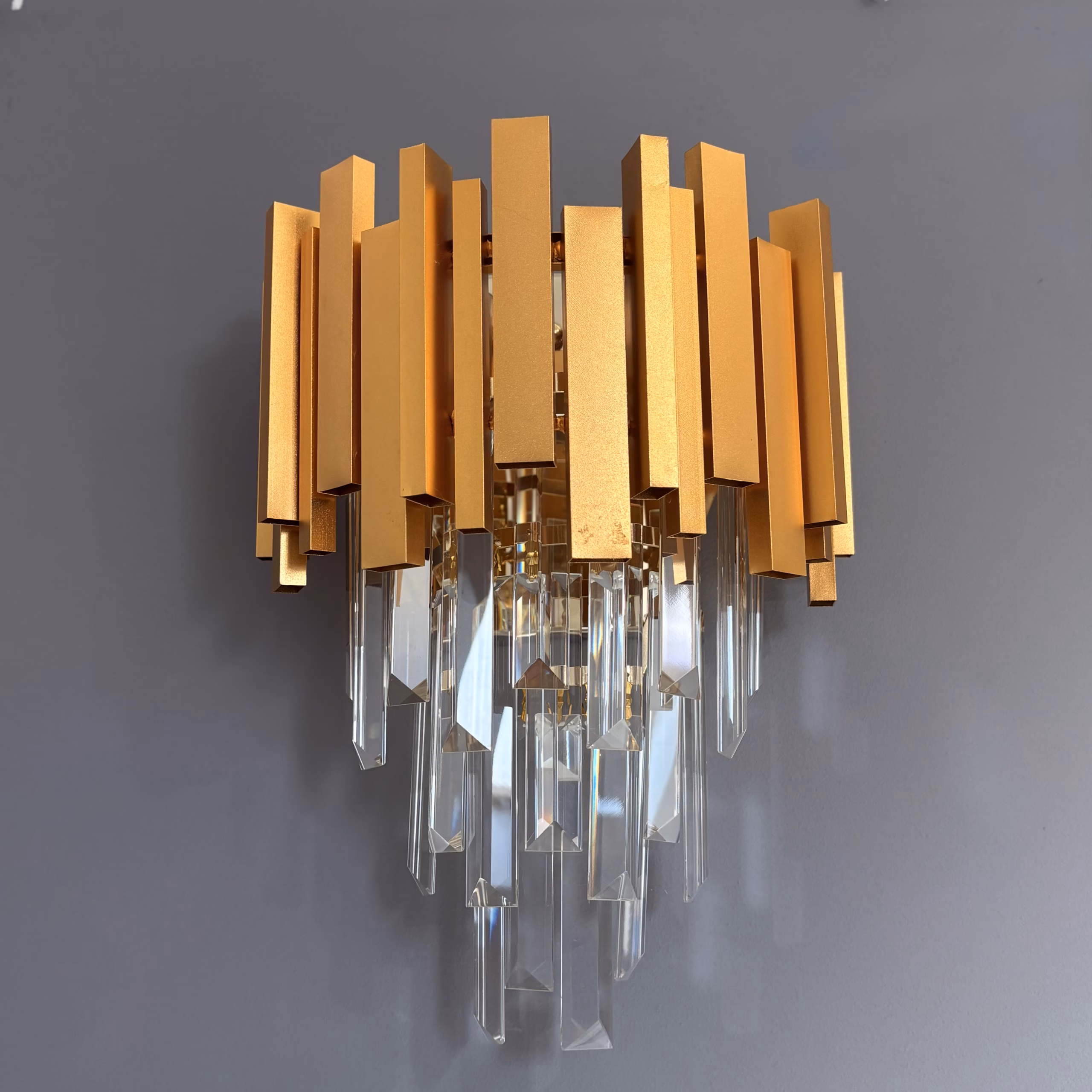 Aplica Modern Prism Gold – Grand Edition îmbină designul contemporan cu strălucirea luxului modern. Barele verticale din metal auriu satinat creează un aspect architectural puternic, iar cristalele lungi tip prismă reflectă lumina într-un joc spectaculos de străluciri.