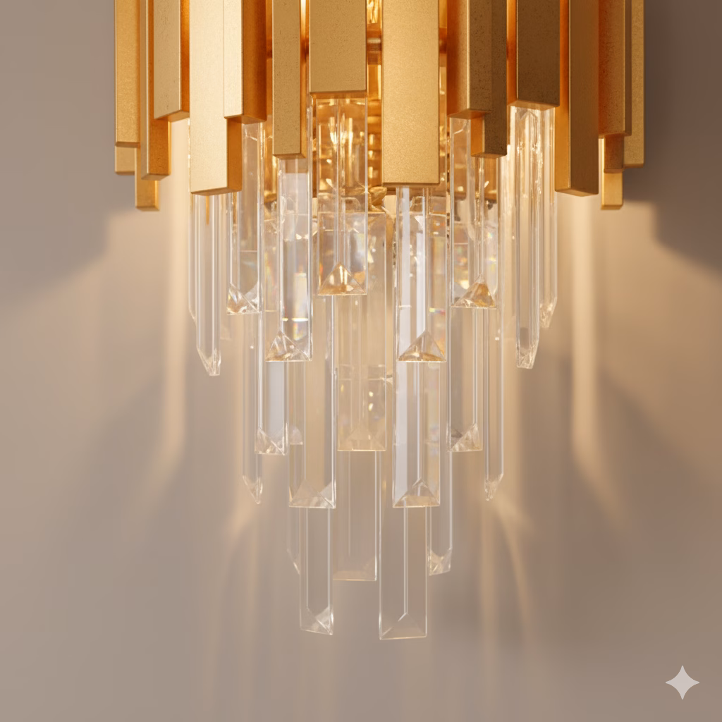 O aplică modernă și elegantă, cu structură aurie și cristale prismatice fațetate. Ideală pentru living, hol, dormitor sau spații premium, unde adaugă lumină caldă și accente sofisticate.