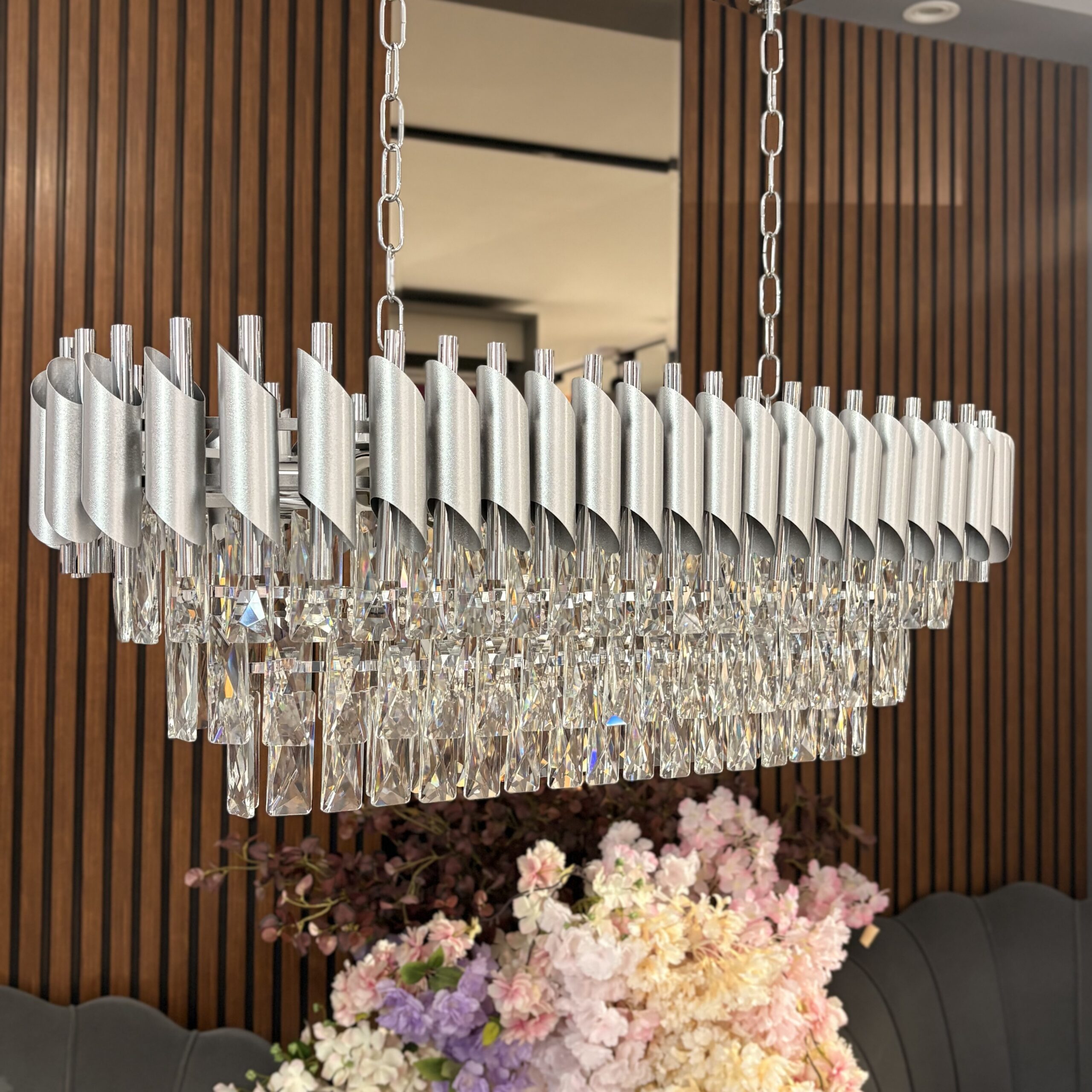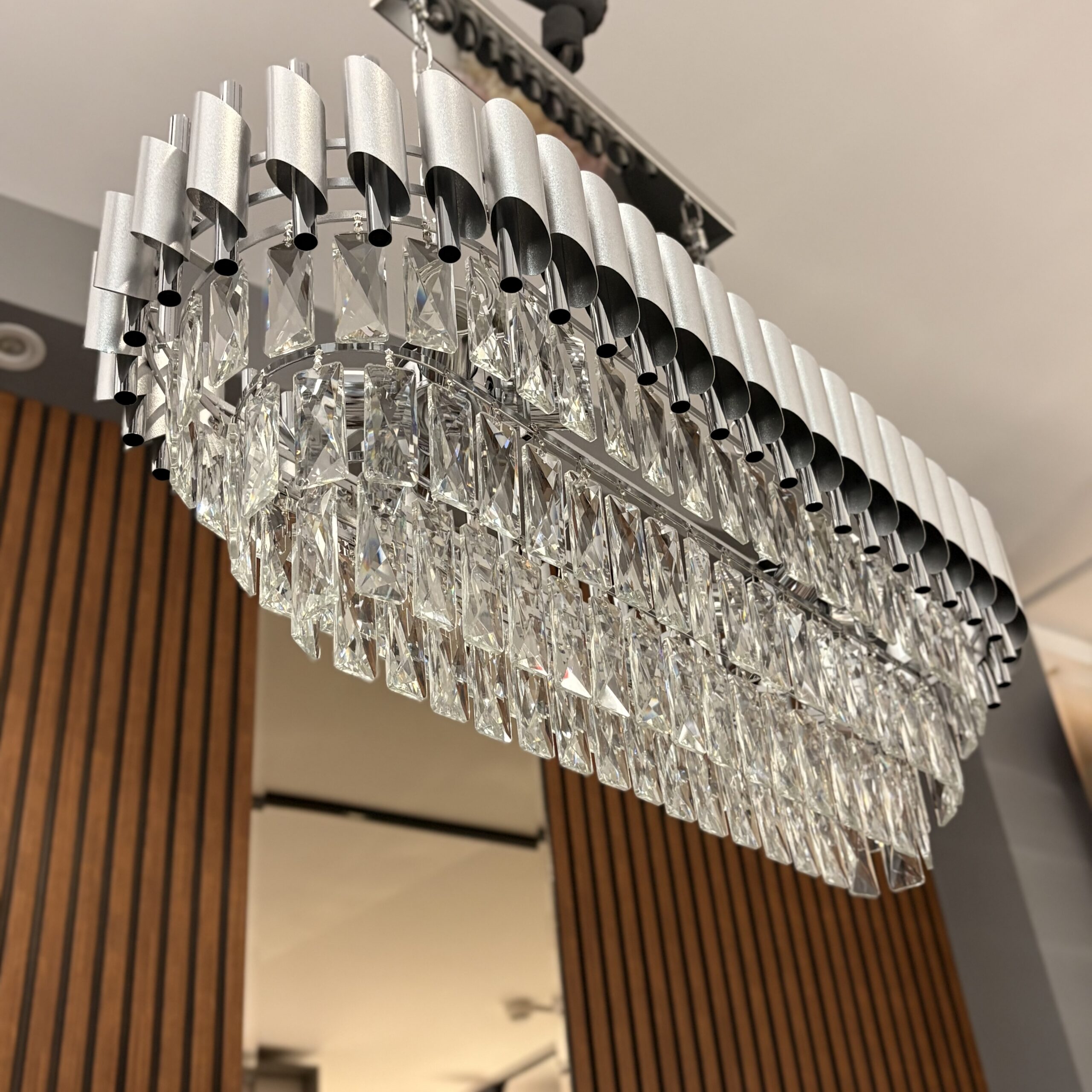 Forma rectangulară îl face ideal pentru spații contemporane precum dininguri, livinguri sau holuri mari, adăugând o notă sofisticată fără a fi ostentativă. Nuanța rece a cromului echilibrează strălucirea cristalelor, oferind o estetică curată și modernă.