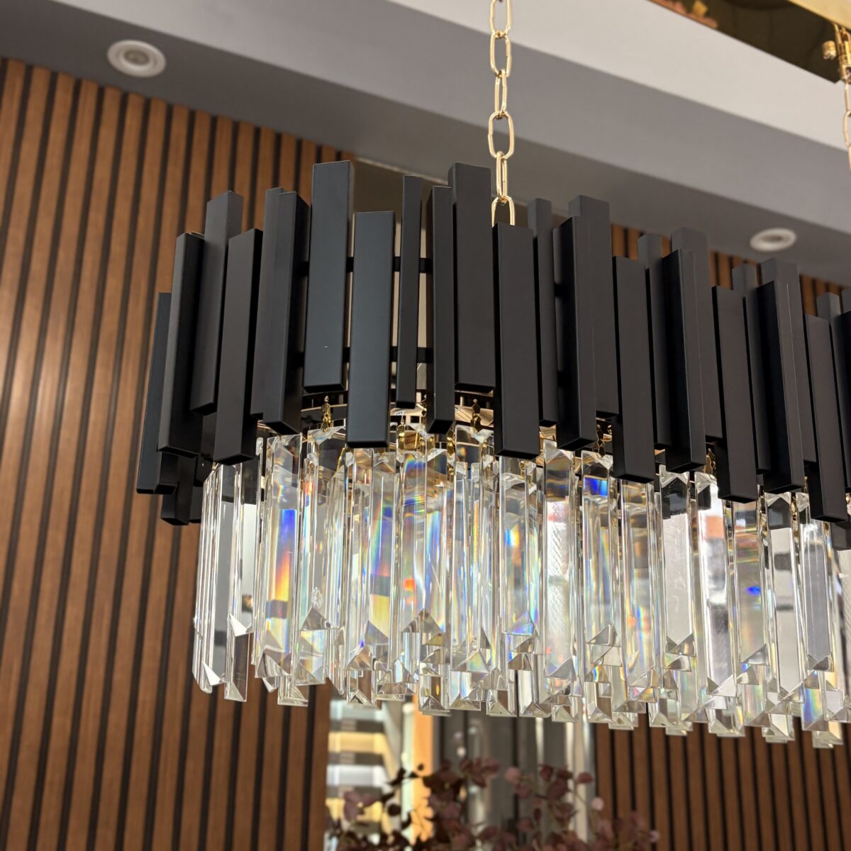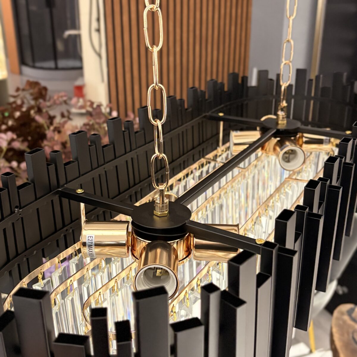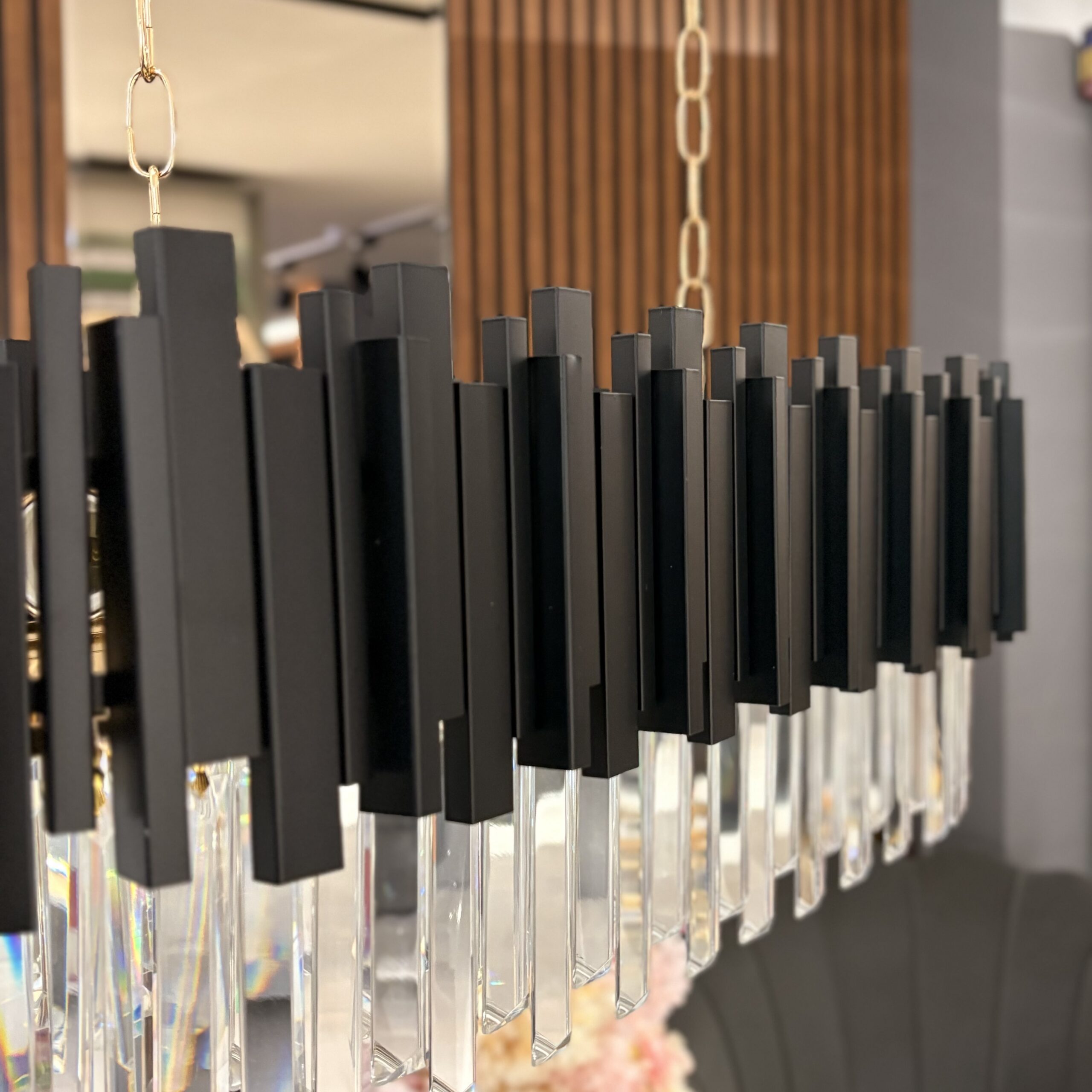 Candelabru rectangular cu finisaj negru mat și cristale K9 dispuse în cascadă. Un contrast elegant între negru profund și reflexiile luminii, perfect pentru spații moderne, dininguri sau livinguri sofisticate.